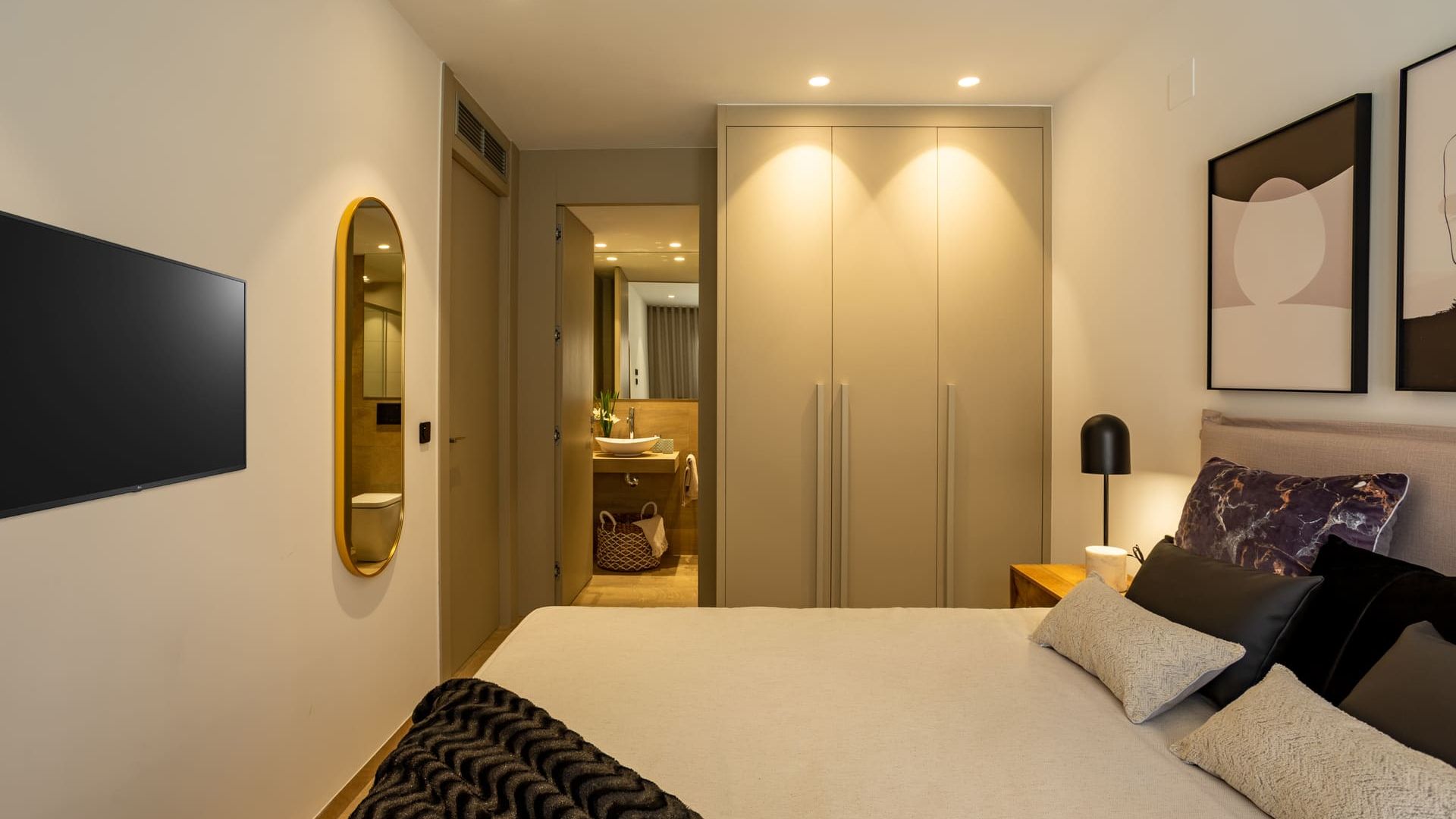 Sie sind so konzipiert, dass sie möglichst viel natürliches Licht erhalten, und verfügen über eine moderne Küche im amerikanischen Stil, die mit einem geräumigen Wohn- und Esszimmer verbunden ist und so eine ideale Umgebung für das Zusammenleben mit Familie und Freunden schafft. Die Schlafzimmer sind mit Einbauschränken ausgestattet und die Bäder verfügen über Fußbodenheizung, Duschabtrennungen und hochwertige Oberflächen. Diese einstöckigen Wohnungen bieten eine praktische und komfortable Aufteilung. Die Küche mit Frühstücksbar ist perfekt in das Wohnzimmer integriert, das sich wiederum zum Außenbereich hin öffnet. Die Schlafzimmer verfügen über geräumige Schränke, während die Bäder komplett ausgestattet sind, um Komfort und Funktionalität zu garantieren.