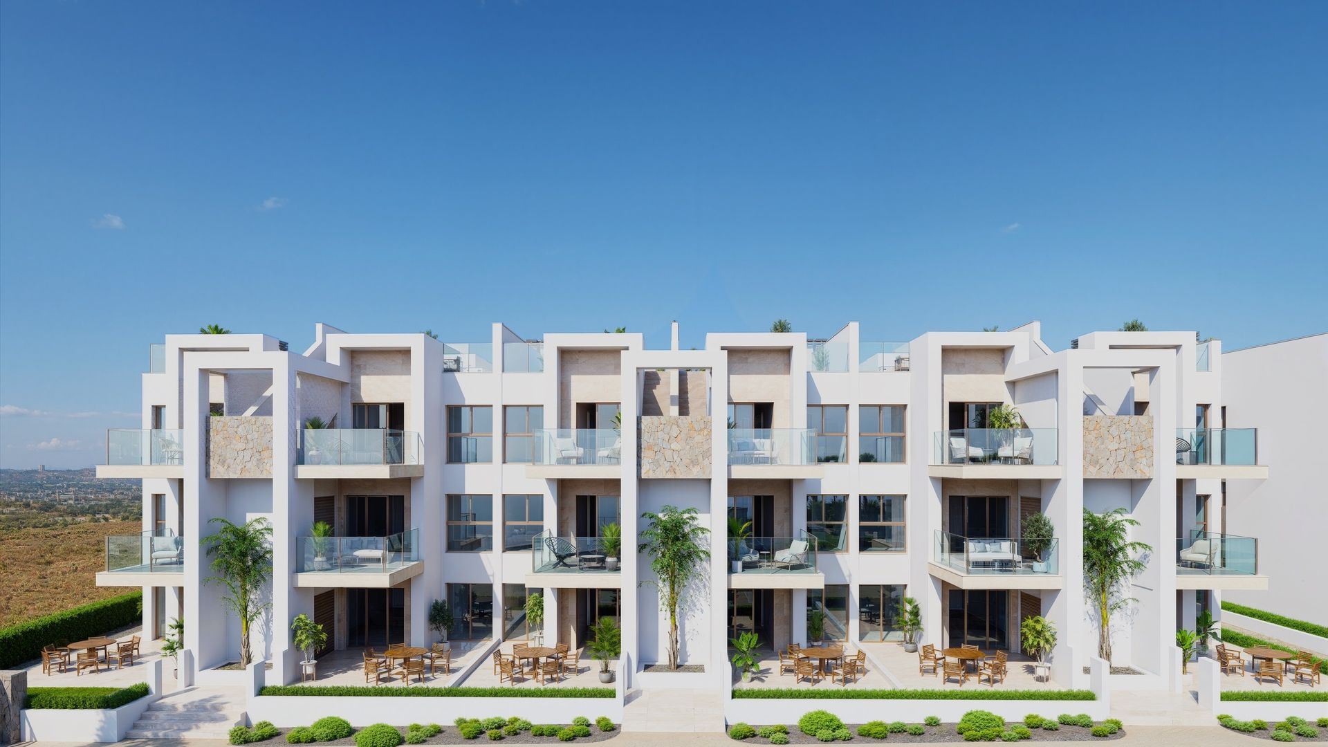 Das Innere der Wohnungen ist mit einem Fokus auf Qualität und Funktionalität gestaltet. Alle Immobilien verfügen über Feinsteinzeugböden, die Haltbarkeit und Stil vereinen. Der Komfort ist durch die Installation von Klimaanlagen und elektrischen Rollläden garantiert, während moderne Geräte den Alltag erleichtern. Einbauschränke bieten effizienten Stauraum, und die Video-Gegensprechanlage bietet ein zusätzliches Maß an Sicherheit. Die Wohnungen sind in Konfigurationen mit 2 oder 3 Schlafzimmern erhältlich, alle mit 2 Bädern, was ausreichend Platz für Familien unterschiedlicher Größe gewährleistet.
