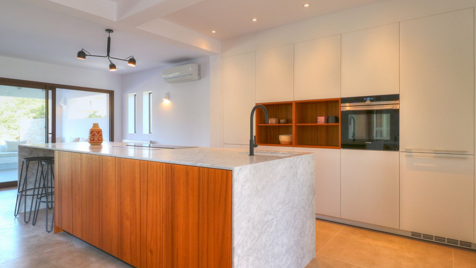 Exclusiva Villa de Lujo en Pla del Mar - MorairaDescubra la quintaesencia del estilo de vida mediterráneo en esta impresionante villa de cuatro dormitorios, estratégicamente ubicada en la prestigiosa zona de Pla del Mar, a solo un paseo del vibrante centro de Moraira y sus hermosas playas. Esta propiedad, que combina una arquitectura atemporal con un diseño interior contemporáneo, ofrece una vida de lujo y confort en una sola planta.Características Destacadas: Vivir en la Planta Principal: Un espacio de vida elegante y diáfano, donde la cocina de concepto abierto con una gran isla central se fusiona con el salón y el comedor. Sus amplios ventanales de suelo a techo se abren a la terraza de la piscina, creando una conexión perfecta entre el interior y el exterior. Diseño de Vanguardia: La villa ha sido completamente reformada con materiales de alta calidad, ofreciendo un ambiente de lujo moderno. Oasis Exterior: Disfrute de la privacidad de su piscina, enmarcada por una elegante pared de piedra natural y realzada por una cascada, un lugar perfecto para relajarse y entretener. Las amplias terrazas, tanto delanteras como traseras, invitan a disfrutar del sol y del aire libre. Dormitorios de Lujo: La propiedad incluye dos suites principales con acceso a las terrazas, además de dos dormitorios dobles adicionales. Ubicación Inmejorable: A solo 250 metros (3 minutos a pie) del centro de Moraira, el puerto deportivo y la playa principal de l'Ampolla. Parcela en el Centro de Moraira: Esta villa se vende junto con una parcela de terreno adicional ubicada en el mismo centro de Moraira. Esta parcela ofrece la flexibilidad de ser utilizada para fines comerciales, residenciales, o simplemente para disfrutar de un jardín más grande, ampliando las posibilidades y el valor de su inversión. Más Allá de lo Convencional: Espacio Versátil: En el sótano, un gran salón con luz natural y acceso exterior se puede adaptar como gimnasio, sala de cine o alojamiento adicional, según sus necesidades. Comodidad Total: Calefacción central, aire acondicionado, cuarto de lavado, un práctico aseo de invitados y un aparcamiento cubierto completan las comodidades de esta exclusiva residencia. Esta villa no es solo una casa, es un estilo de vida de lujo, tranquilidad y conveniencia en uno de los enclaves más deseados de la Costa Blanca.