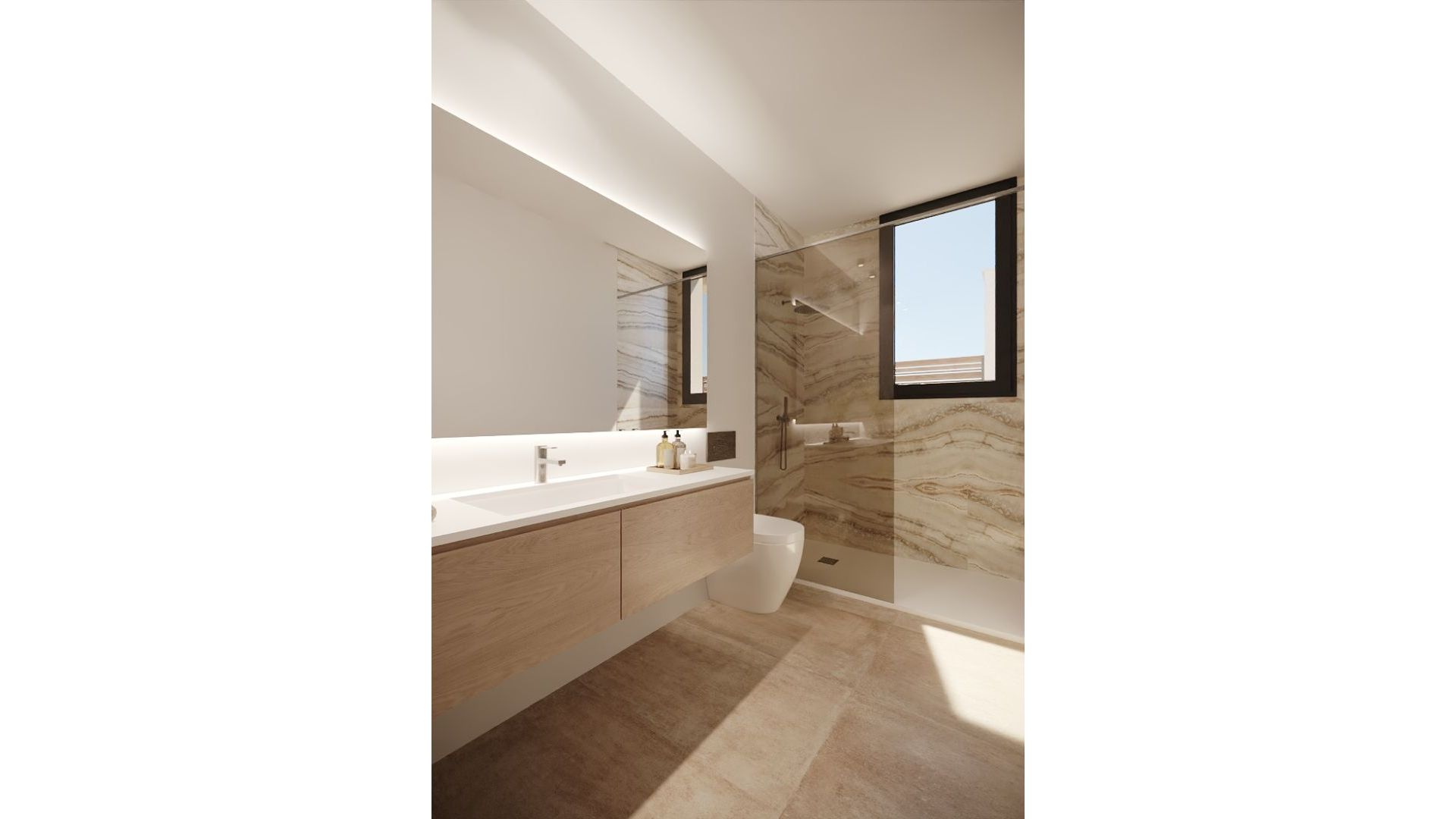 Chaque villa se trouve sur un terrain généreux de 441 m² et comprend une piscine privée de 2,40 x 6,00 mètres, un jardin, une terrasse et un solarium spectaculaire de 63 m², idéal pour profiter de plus de 300 jours de soleil par an. Le design extérieur combine des lignes épurées et modernes avec des matériaux résistants et durables, atteignant un équilibre parfait entre l'esthétique, la fonctionnalité et un entretien réduit. Les espaces sont conçus pour la vie en plein air, pour accueillir des réunions ou simplement pour se détendre au soleil dans un cadre privé.