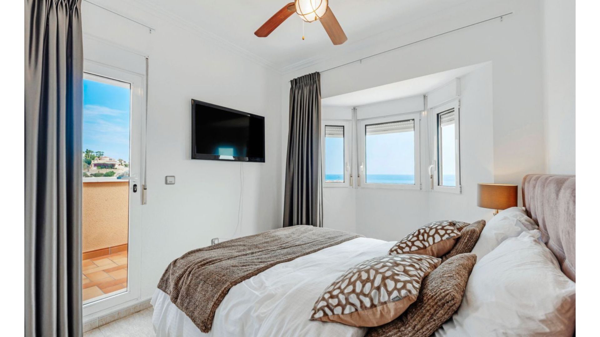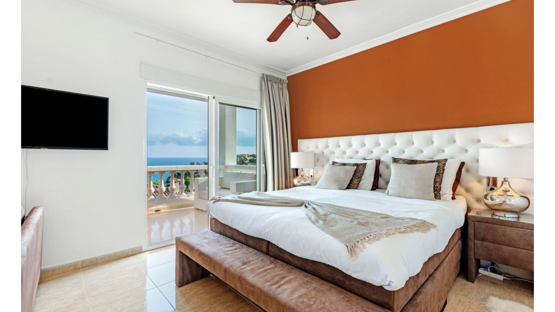 De luxueuze master suite beschikt over een eigen loungehoek, een walk-in closet, een ruime en-suite badkamer en een privéterras met spectaculair zeezicht over de Middellandse Zee.