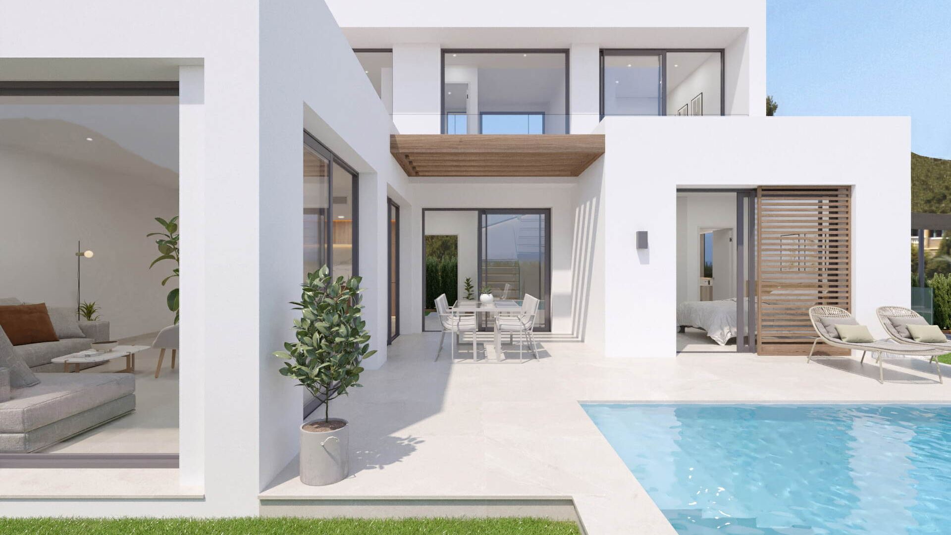 De buitenruimtes van deze woningen zijn ontworpen om optimaal te genieten van het mediterrane klimaat. Elk chalet heeft een privé tuin, perfect om een persoonlijke oase van rust te creëren. De terrassen bieden extra ruimte voor buitenplezier, ideaal voor diners bij zonsondergang of ontspannende momenten met uitzicht op zee. Bovendien is er de optie om een privézwembad toe te voegen, wat een vleugje luxe en exclusiviteit toevoegt. De aanwezigheid van pergola's biedt schaduw en comfort, waardoor de buitenruimtes het hele jaar door een aangename plek zijn.