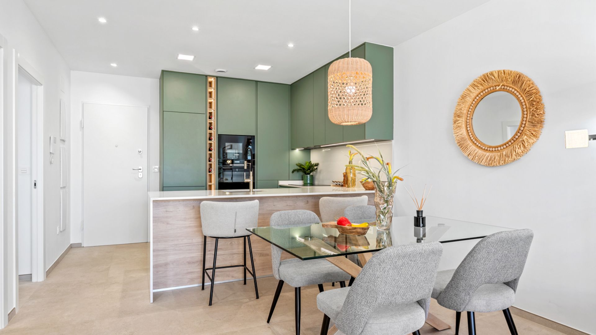 Het interieur van deze vrijstaande woningen is ontworpen met comfort en stijl in gedachten. Met een indeling die drie slaapkamers en twee badkamers omvat, is elke ruimte geoptimaliseerd voor ruimtelijkheid en functionaliteit. De porseleinen tegelvloeren geven een moderne uitstraling en zijn gemakkelijk te onderhouden. De woningen zijn uitgerust met airconditioning om het hele jaar door comfort te garanderen. Bovendien zijn ze voorzien van geïntegreerde apparaten, ingebouwde kasten die de opbergruimte maximaliseren, elektrische rolluiken voor extra gemak en een video-intercom die de veiligheid garandeert.
