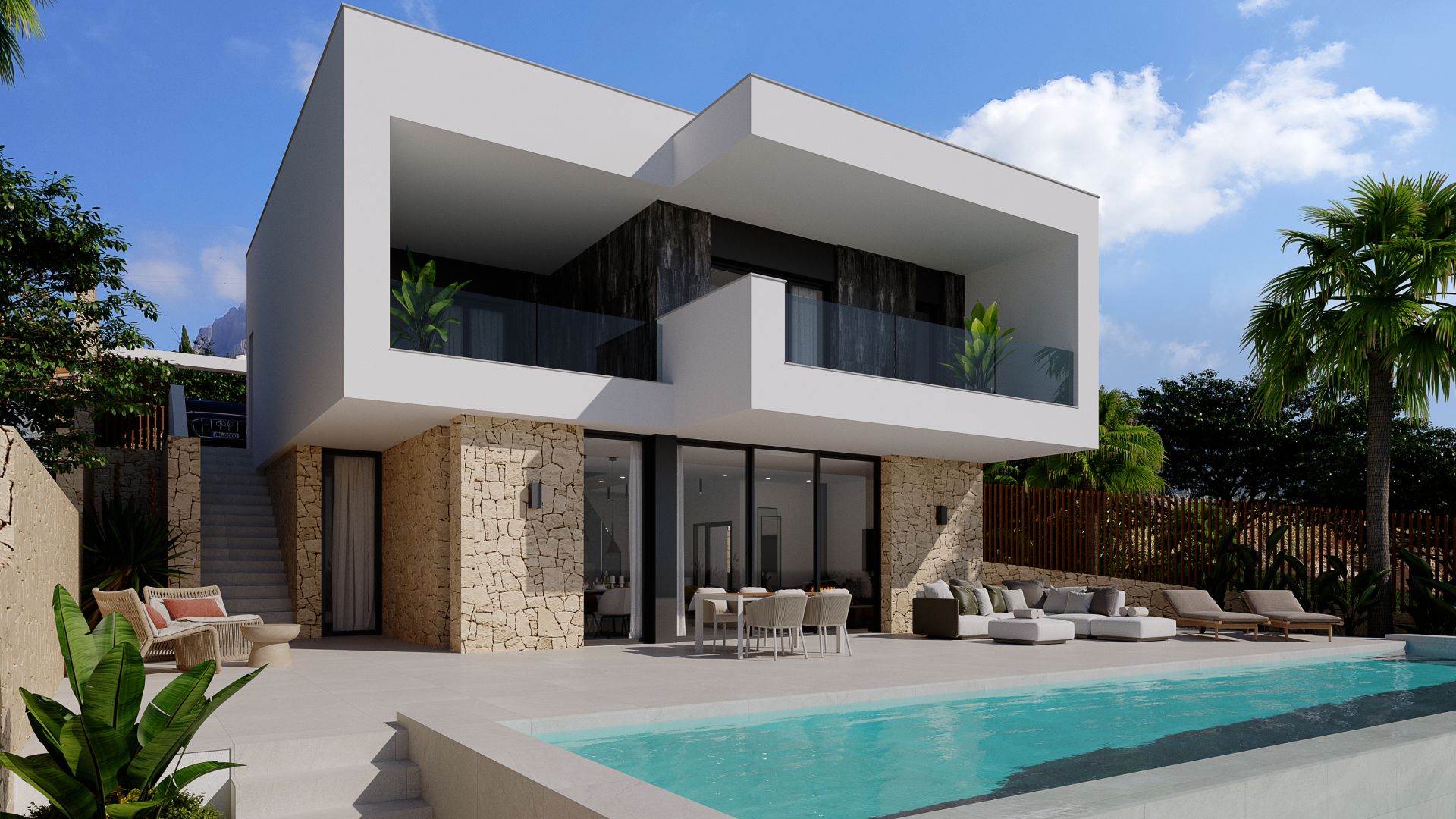 The house is distinguished by its architectural design that harmonises with the surrounding natural environment, exhibiting a modern and elegant aesthetic. The façades combine local materials such as stone and wood, providing a sense of warmth and belonging to the Mediterranean landscape. The large windows not only maximise natural light but also offer panoramic views of the Puig Campana mountain, the golf course and the surrounding green landscape. Each villa has spacious terraces and outdoor seating areas, ideal for enjoying the weather and the views. Private swimming pools, seamlessly integrated into the exterior design, invite moments of relaxation and entertainment in the privacy of your own home. The meticulously landscaped gardens are planted with low-maintenance native species, respecting local biodiversity and promoting a sustainable environment. The integration of outdoor lighting systems enhances the architectural beauty of the homes after dark, creating a welcoming and safe environment.