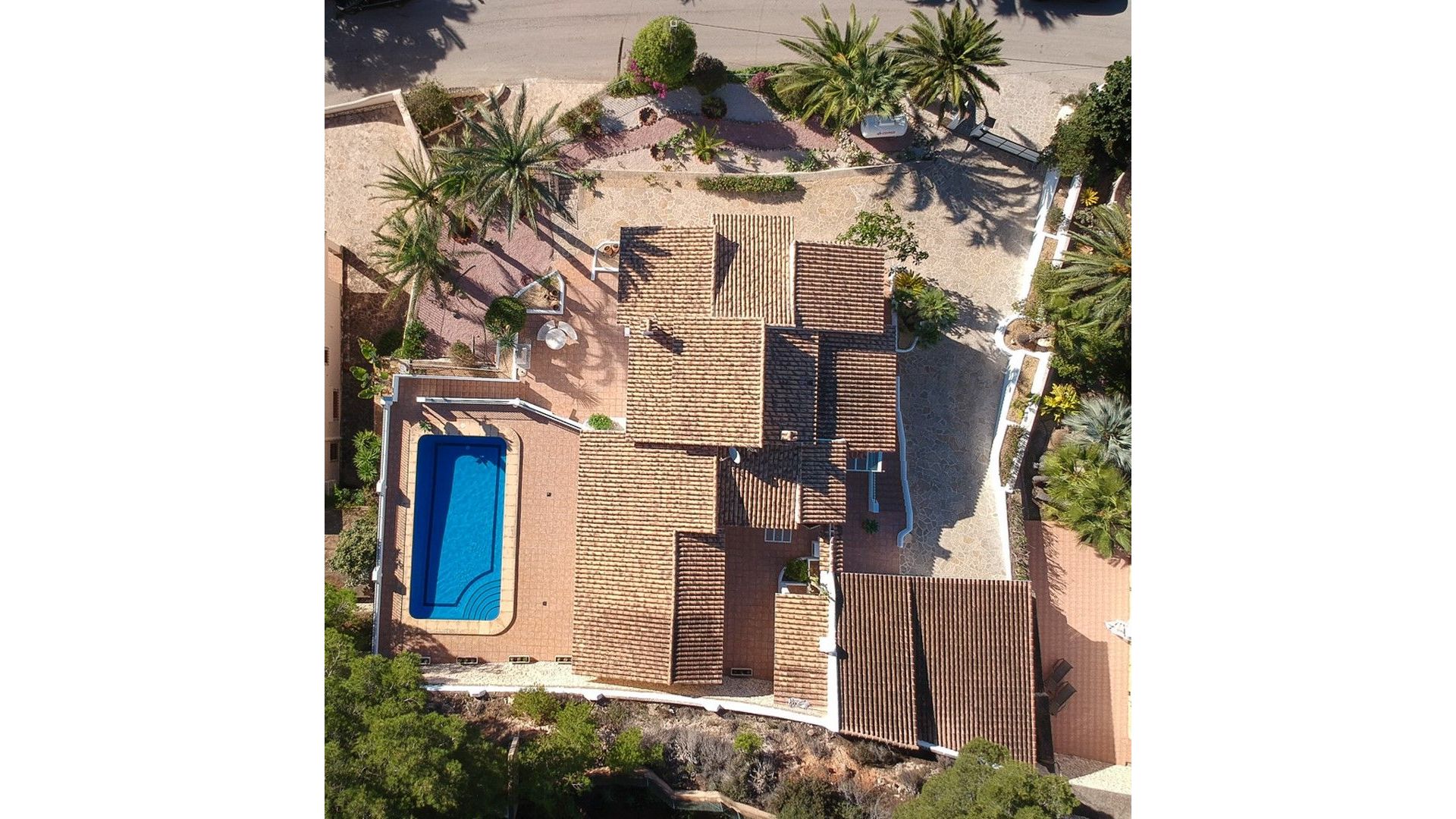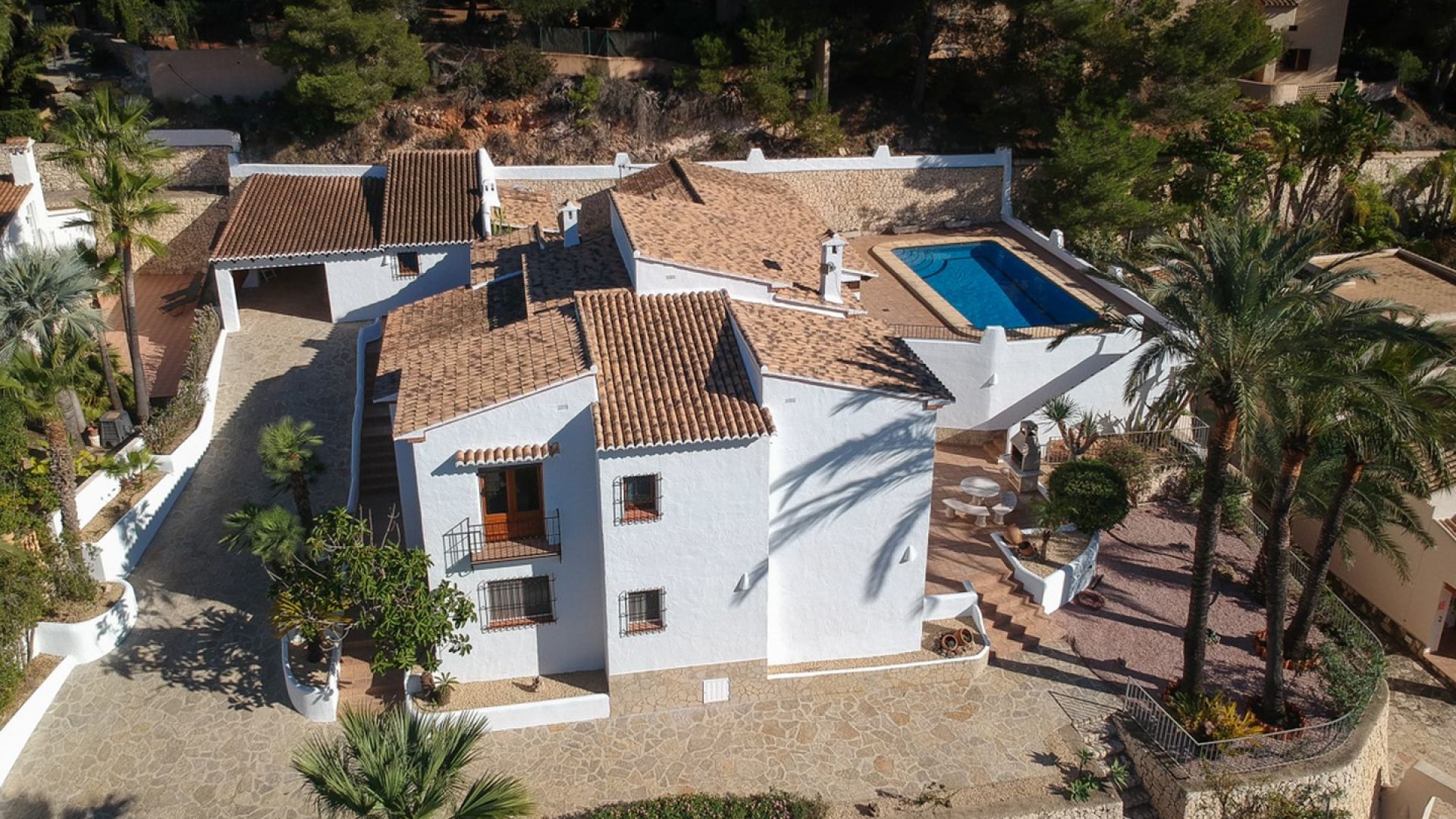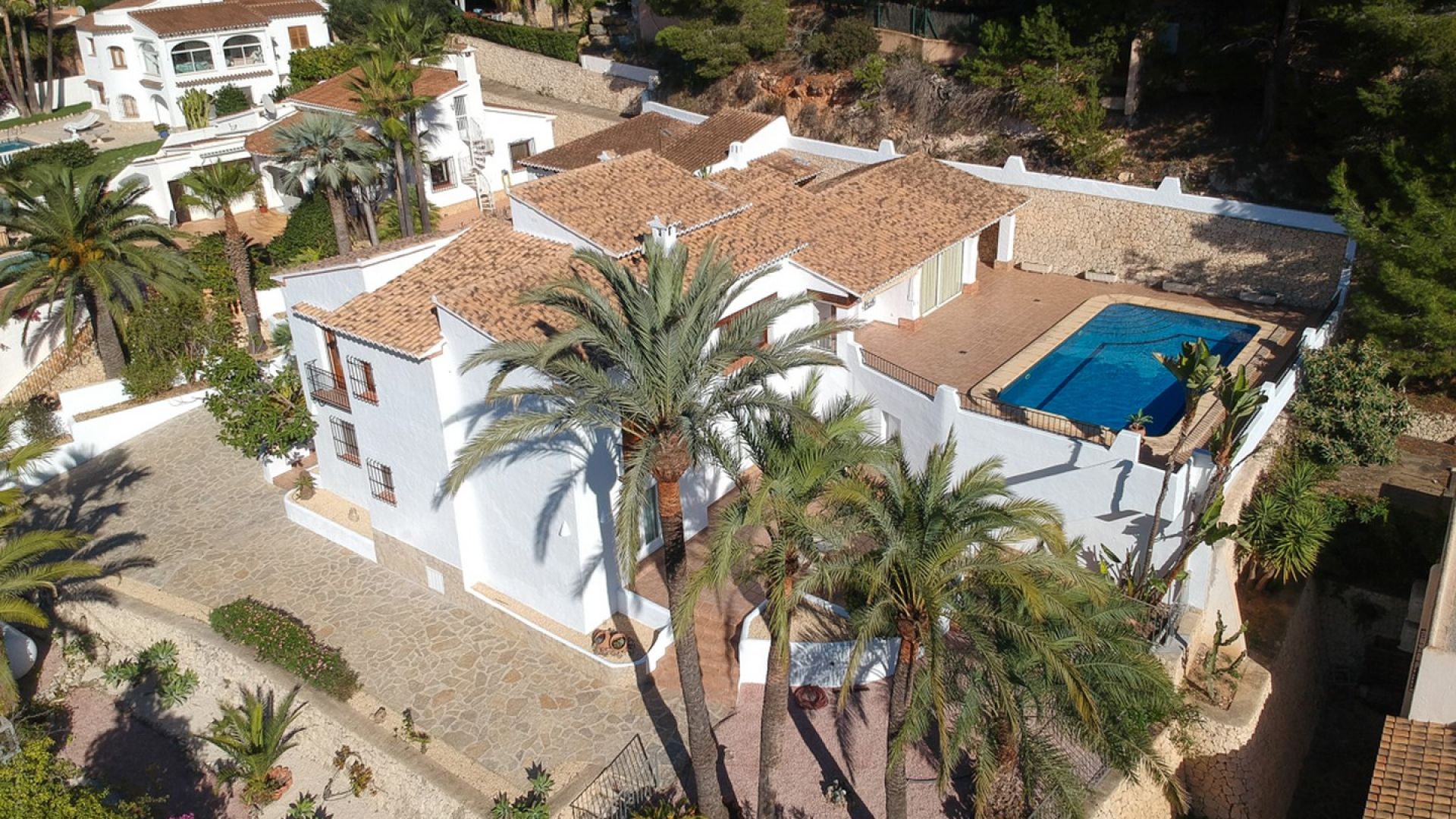 An Exclusive Sea View Villa for Sale in Prestigious San Jaime, MorairaPrepare to be captivated by this magnificent and large luxury villa boasting truly spectacular sea views within the highly prestigious San Jaime Moraira urbanisation. This is a privileged opportunity to secure one of the finest villas for sale in San Jaime Moraira, perfectly positioned on a quiet residential road just over a kilometre from essential amenities, including the golf clubhouse, supermarket, and the beautiful beaches.The heart of this superb 378 m2 property is its expansive open-plan living area, which elegantly spans the front of the building. The interconnected living room, dining room, and lounge area all open directly onto the sunny pool terrace, ensuring that fantastic sea views and abundant natural light flood every corner of this luxurious space. This design creates a beautiful, seamless indoor/outdoor lifestyle ideal for Mediterranean living.Practicality meets luxury in the well-designed layout. The main entrance level offers the huge advantage of level access from the parking area (no stairs!) and features an entrance hall, the main living zones, a fully equipped kitchen with access to an external barbecue terrace for effortless alfresco dining, two double bedrooms, a large bathroom and a second bathroom with shower. An internal staircase connects this to the lower floor, which provides further flexible accommodation, including a second lounge with direct garden access, a utility area with washing and toilet facilities, two more well-proportioned double bedrooms, and a second large bathroom. Additionally, the parking area includes a convenient garage with adjoining storage, as well as a dedicated room housing a sauna for relaxation.The property is completed by fully enclosed, low-maintenance Mediterranean gardens, beautifully stocked with a selection of palms and plants and finished with gravel for ease of care. If your search is focused on finding premium sea view villas in Moraira that perfectly blend space, high-end luxury, and an unbeatable location, this exceptional property is an absolute must-see.