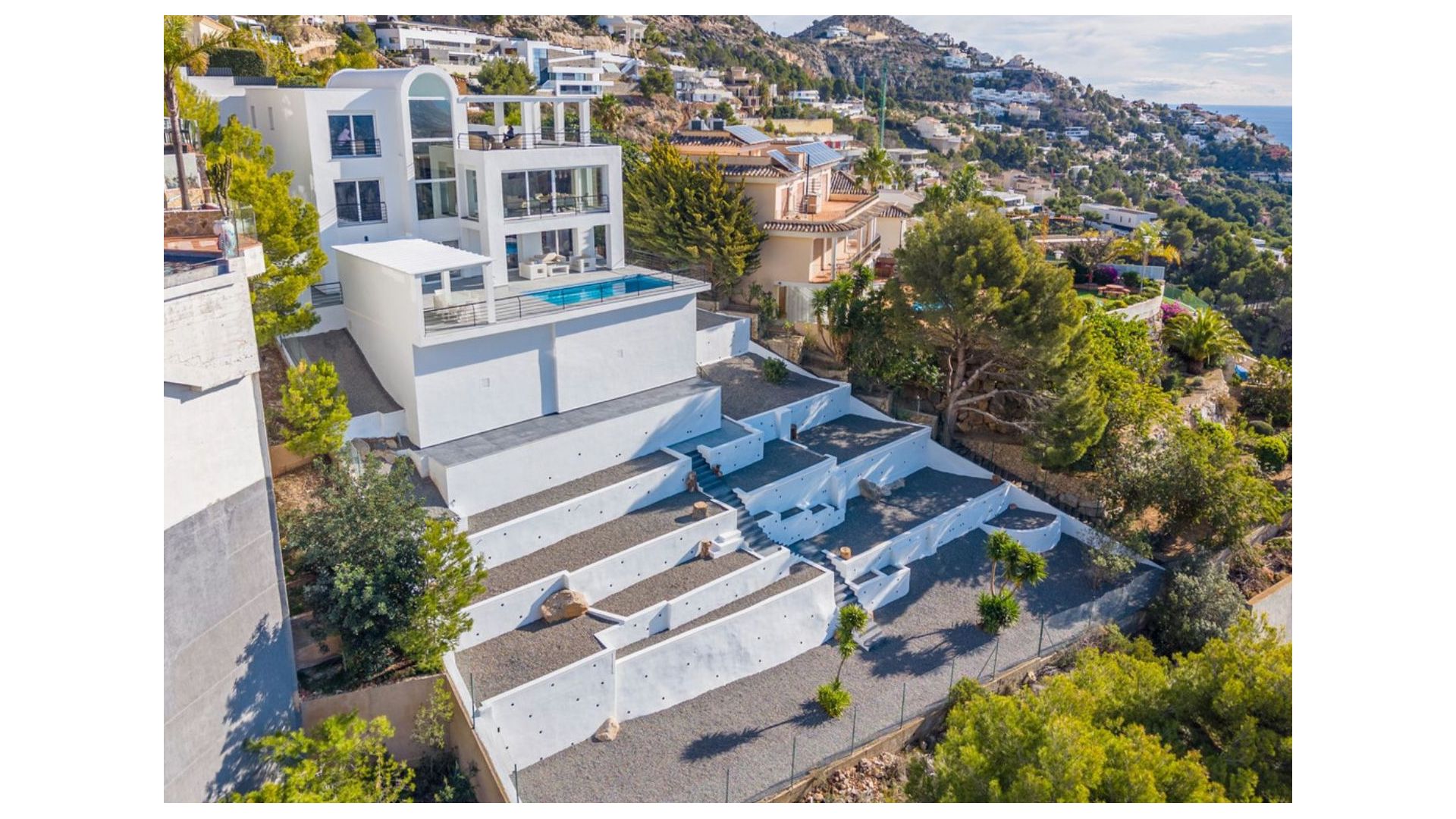 Der Außenbereich wurde für Entspannung und Unterhaltung konzipiert – ein privater Rückzugsort mit weitläufigen Terrassen, die die Swimmingpool-Anlage umgeben. Eine überdachte Außenküche mit Essbereich lädt dazu ein, das mediterrane Klima das ganze Jahr über zu genießen.