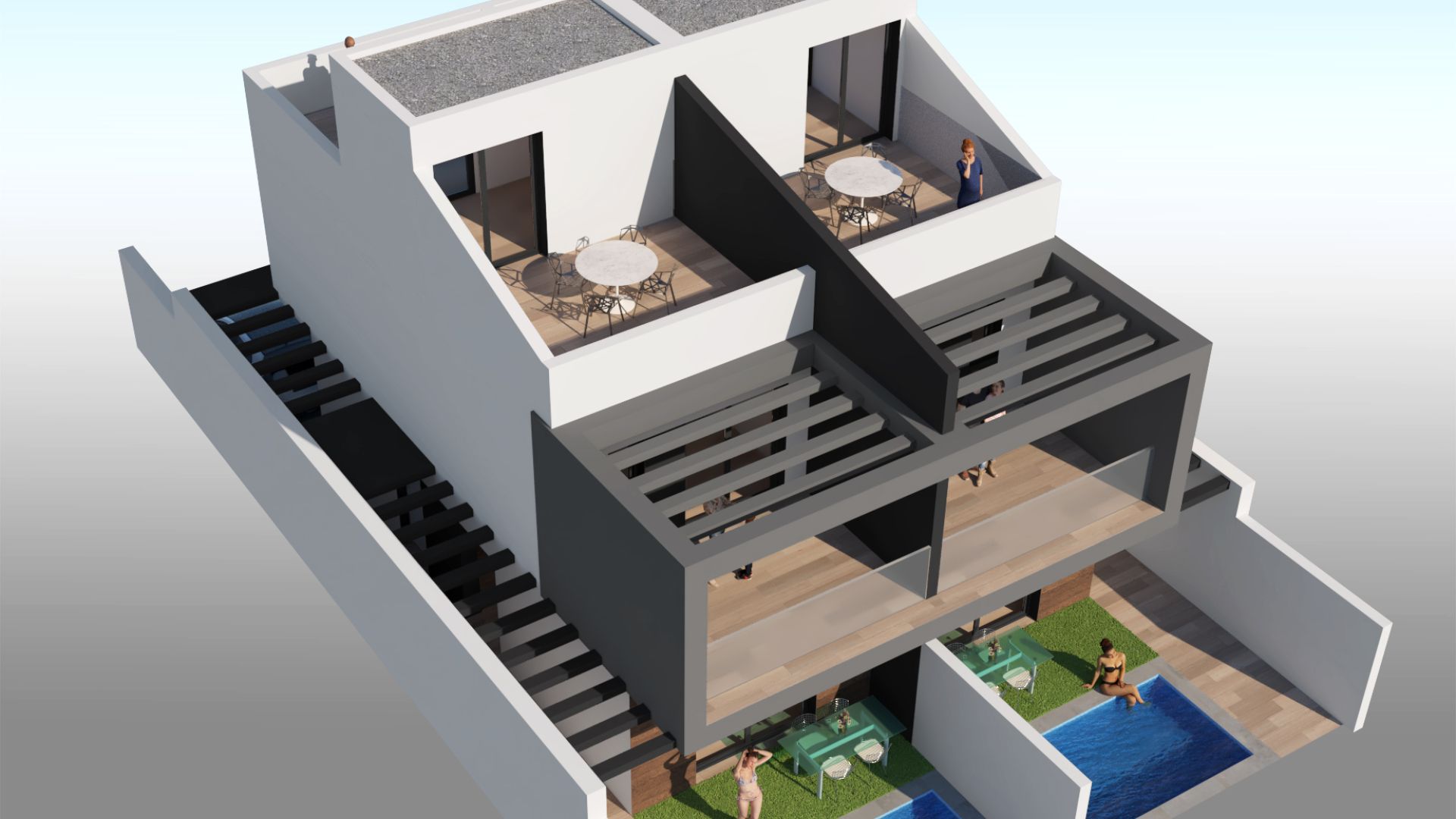Die Außenbereiche dieser Reihenhäuser in San Javier sind darauf ausgelegt, das mediterrane Klima optimal zu nutzen. Jede Immobilie verfügt über einen privaten Garten, ideal, um eine persönliche Oase der Ruhe zu schaffen. Darüber hinaus gibt es eine Terrasse und ein Solarium, die zahlreiche Außenbereiche bieten, um sich zu entspannen oder gesellschaftliche Zusammenkünfte zu genießen. Die Einbeziehung einer Pergola verleiht Eleganz und Funktionalität, indem sie Schatten und Stil bietet. Um das Erlebnis abzurunden, verfügt jedes Haus über einen privaten Pool, ideal, um sich an heißen Sommertagen abzukühlen.