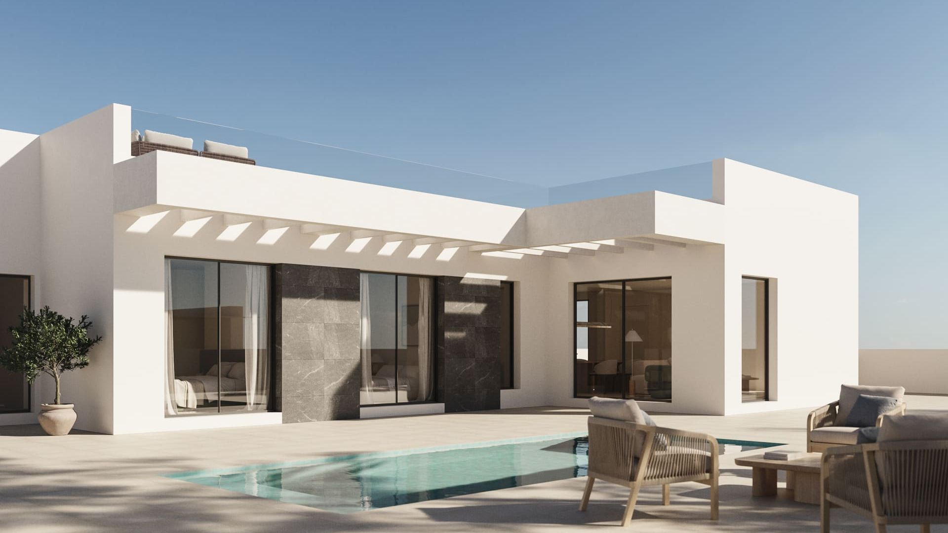 Cada villa está construida sobre una parcela de 453 m², rodeada de jardines privados diseñados para disfrutar del aire libre. Una piscina privada con un bar junto a la piscina se convierte en el corazón del espacio exterior, perfecto para relajarse o disfrutar de momentos sociales. Las terrazas y el amplio solárium de 68 m² ofrecen vistas espectaculares del entorno natural, permitiendo disfrutar del clima mediterráneo durante todo el año. Además, las villas cuentan con iluminación LED exterior, puertas automáticas y un diseño paisajístico que complementa su estilo contemporáneo.