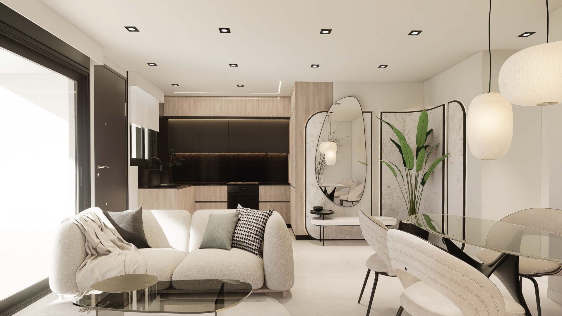 Las viviendas de la planta baja cuentan con amplios jardines privados donde disfrutar del clima durante todo el año. Por su parte, los dúplex en planta alta ofrecen balcones soleados y espectaculares terrazas en la azotea, ideales para contemplar las vistas despejadas de los alrededores o relajarse bajo el sol mediterráneo. Todo el entorno ha sido concebido para integrarse armónicamente con la luz y el aire libre, potenciando cada rincón como un espacio habitable.