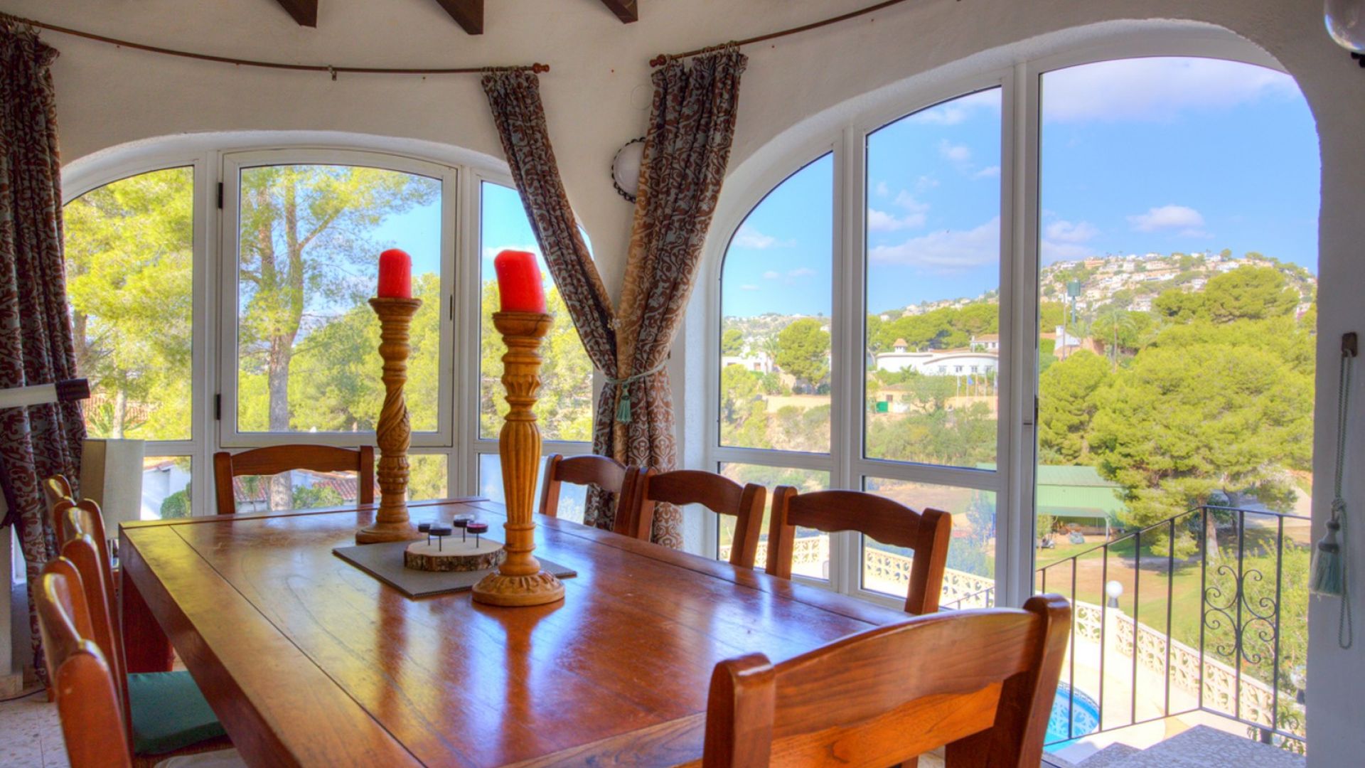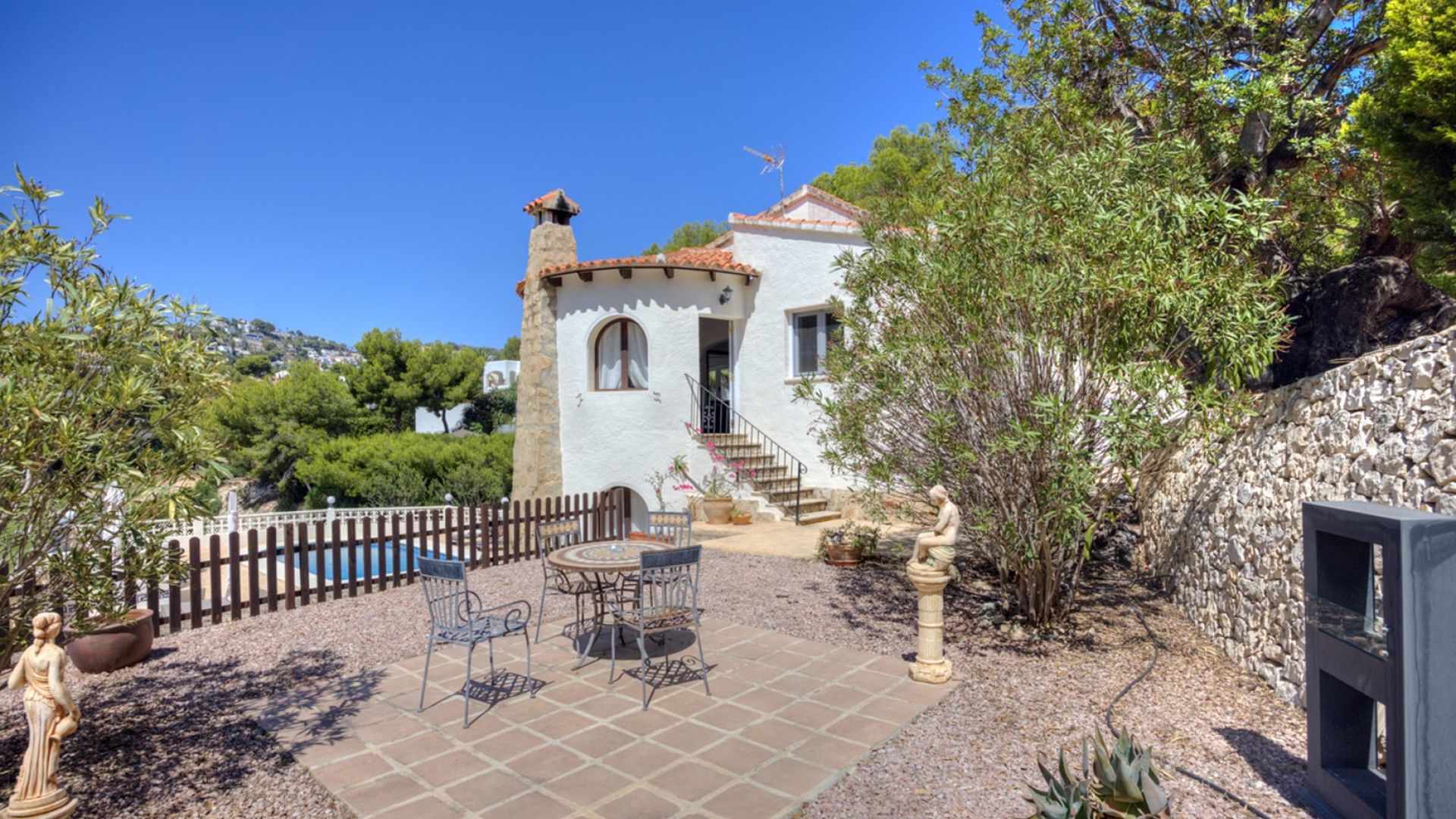 Villa Frontline Golf en San Jaime, Moraira - Apartamento de invitados y piscinaVilla tradicional de 4 dormitorios con vistas panorámicas al campo de golf, piscina privada y apartamento independiente para invitados. Situada en una parcela de 1000 m² en una tranquila calle residencial, a pocos pasos de tiendas, restaurantes y la playa de Cala Andrago. Los interiores modernizados, el amplio aparcamiento y los excelentes espacios exteriores la convierten en una vivienda familiar ideal o en una excelente inversión para alquilar.Características de la propiedad:Excelente exposición al sol y vistas ininterrumpidas al campo de golf.Aparcamiento privado para varios vehículos.Aire acondicionado frío y calor en todos los dormitorios.A poca distancia de tiendas, playas y una buena selección de bares y restaurantes.Ubicación privilegiada en San Jaime, junto al campo de golf.Acerca de esta propiedad:Esta encantadora villa de estilo tradicional de cuatro dormitorios disfruta de vistas ininterrumpidas al campo de golf de San Jaime, ofreciendo una ubicación privilegiada en primera línea en una de las zonas más codiciadas de Moraira.Situada en una generosa parcela de 1.000 m², la propiedad cuenta con una piscina privada y terrazas soleadas, todo ello en una tranquila calle residencial. Con una ubicación perfecta, la villa se encuentra a solo 10 minutos a pie de la Casa Club y del popular restaurante Dos Toros, a 15 minutos a pie de tiendas, bares de tapas y restaurantes, y a un agradable paseo de 20 minutos de la hermosa zona de la playa de Cala Andrago.La vivienda principal se encuentra en la planta superior y cuenta con: Una luminosa sala de estar diáfana con una cocina modernizada. Un comedor acristalado con impresionantes vistas al campo de golf. Dos dormitorios dobles y un cuarto de baño.En la planta baja, con acceso independiente, se encuentra un espacioso apartamento de invitados que ofrece: Dos dormitorios dobles. Un cuarto de baño con ducha a ras de suelo. Una sala de estar y comedor de planta abierta con cocina equipada. Acceso directo a la terraza de la piscina orientada al oeste, perfecta para disfrutar del sol de la tarde.Las características exteriores incluyen: Piscina privada rodeada de una amplia terraza con espacio para tumbonas. Aparcamiento dentro de la parcela para varios vehículos. Un trastero de 30 m².La propiedad está bien cuidada y cuenta con varias mejoras, como puertas de seguridad de aluminio, nuevas ventanas de doble acristalamiento en los dormitorios de la planta superior y aire acondicionado frío/calor instalado en todos los dormitorios.Esta villa combina una ubicación privilegiada frente al campo de golf, alojamiento independiente para invitados y acceso a pie a los servicios, lo que la convierte en una vivienda permanente ideal, un refugio vacacional o una inversión para alquilar.