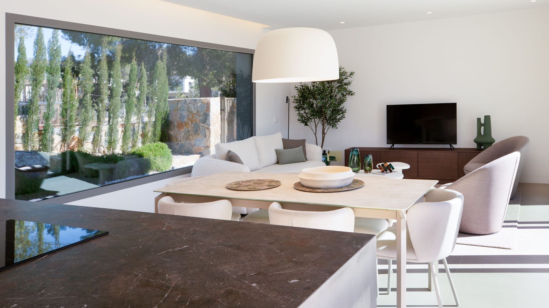 Todas las villas cuentan con 3 dormitorios y entre 2 y 4 baños, dependiendo de la tipología. Están completamente amuebladas con piezas de diseño seleccionadas para realzar la elegancia de cada estancia, sin renunciar a la funcionalidad. La distribución interior es amplia, con cocina abierta, salón comedor luminoso y acabados de alta gama. El dormitorio principal incorpora vestidor y baño en suite, y los espacios interiores se conectan fluidamente con el exterior, favoreciendo la entrada de luz natural y las vistas despejadas. Las viviendas también incluyen aseo de cortesía y detalles como climatización integrada y carpintería de alta eficiencia.