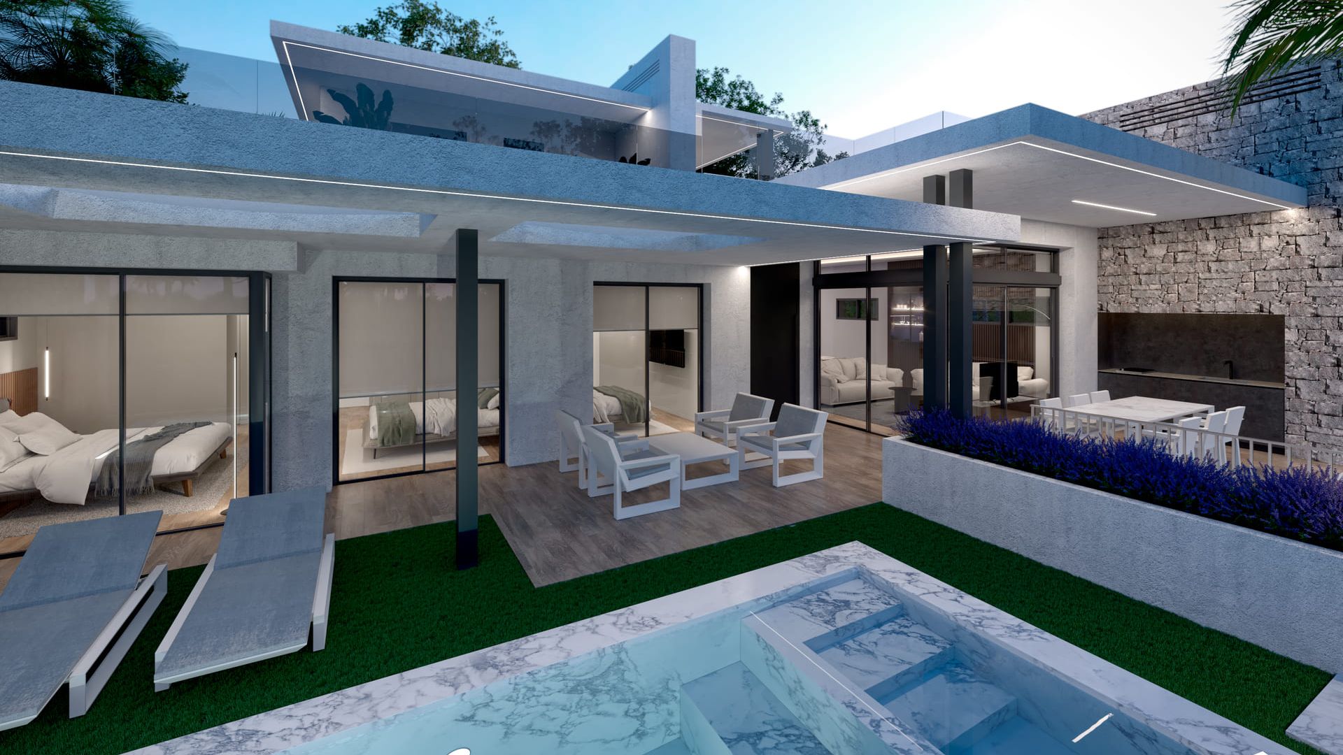 Le design extérieur des villas se distingue par son élégance contemporaine et ses espaces ouverts, parfaits pour profiter du climat méditerranéen. Les villas sont entourées de vastes jardins privés qui invitent à la détente et aux loisirs en plein air. Chaque propriété dispose d'une piscine privée, où vous pouvez vous détendre tout en profitant de la vue sur les montagnes. Les villas sont équipées d'un coin cuisine extérieur, idéal pour les repas en plein air et les célébrations en famille ou entre amis. La terrasse lumineuse et aérée offre un espace supplémentaire pour profiter de la vie en plein air, tandis que le solarium sur le toit offre des vues panoramiques spectaculaires, un ensoleillement permanent et un espace parfait pour se détendre ou se rencontrer.