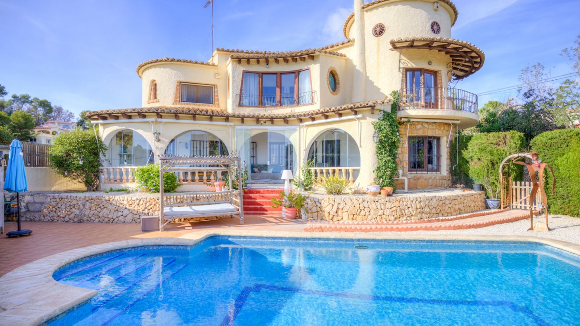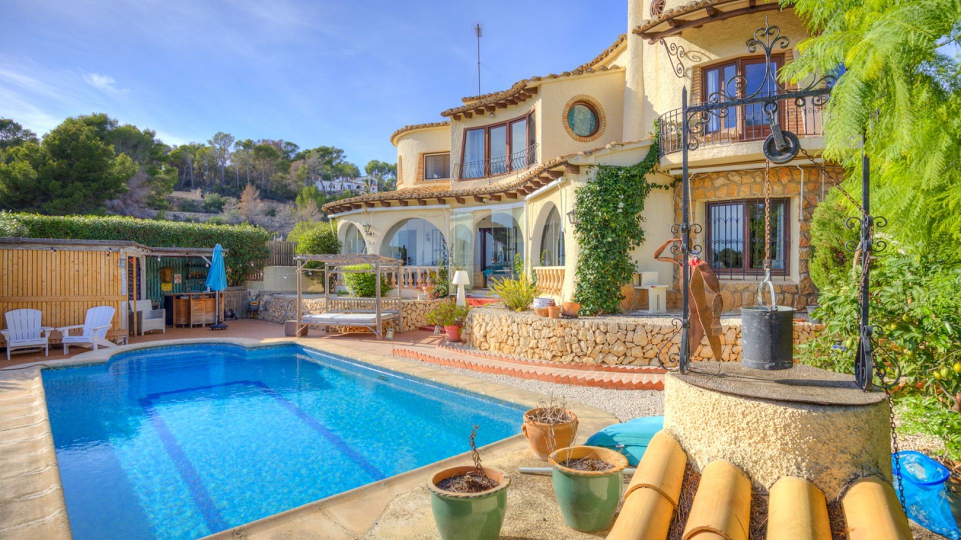 Magnifique villa méditerranéenne à vendre à Benissa – Avec vue sur la mer, annexe pour les invités et à quelques pas de la plageCette superbe villa de style méditerranéen à vendre à Benissa offre la combinaison parfaite entre le charme traditionnel espagnol, le confort moderne et un emplacement côtier imbattable. Située à seulement 550 mètres de la plage et à proximité des baies pittoresques de Cala Advocat et Baladrar, la propriété bénéficie d'une vue magnifique sur la mer et de la commodité des restaurants et des commerces accessibles à pied, ainsi que de toutes les commodités de Moraira, à un peu plus d'un kilomètre.Construite à l'origine en 1990 comme maison témoin pour mettre en valeur le savoir-faire d'un constructeur local, cette grande villa de 5 chambres et 6 salles de bains se caractérise par ses proportions généreuses, son architecture intemporelle et sa qualité de construction exceptionnelle. La maison principale s'étend sur deux étages et comprend trois salons séparés, un grand porche couvert au bord de la piscine, un balcon-terrasse vitré et une cuisine spacieuse avec coin repas. Chacune des trois chambres dispose de sa propre salle de bains, deux d'entre elles offrant également un dressing, idéal pour la vie de famille ou pour accueillir des invités avec style.La conception architecturale est profondément influencée par les traditions espagnoles de style néo-méditerranéen. Les murs en stuc crème, les tourelles incurvées, les vérandas voûtées et les toits en tuiles de terre cuite créent une esthétique chaleureuse et accueillante qui s'intègre parfaitement au paysage environnant. Des détails tels que la maçonnerie artisanale, les balcons en fer forgé et les poutres apparentes en bois ajoutent de l'authenticité et du caractère, tandis que les grandes fenêtres laissent entrer la lumière naturelle et encadrent la vue imprenable sur la piscine et le jardin.Au cœur de la propriété se trouve une belle terrasse avec piscine privée, entourée d'une végétation mature, de murs en pierre naturelle et d'accents en terre cuite, parfaite pour la vie en plein air et les réceptions. L'annexe indépendante de la propriété, située à l'arrière du terrain, offre 98 mètres carrés d'espace privé comprenant deux chambres doubles, deux salles de bains, une cuisine ouverte et un coin repas, un bureau et une terrasse couverte donnant sur les jardins clos orientés à l'ouest.Au fil des ans, la villa a été rénovée avec goût : travaux d'électricité et de plomberie, installation de la climatisation chaud/froid dans les chambres et les pièces à vivre, portails motorisés, ventilateurs de plafond, rideaux de verre rétractables dans la naya et stores sur les fenêtres orientées sud, garantissant confort et fonctionnalité tout en préservant son âme méditerranéenne.Que vous recherchiez une maison familiale sur la côte de Benissa, une résidence secondaire avec vue sur la mer ou un bien immobilier à louer, cette villa offre une flexibilité exceptionnelle. Les propriétaires peuvent facilement profiter de la résidence principale tout en louant l'annexe ou vice versa, une configuration idéale pour le style de vie et la génération de revenus.Alliant une architecture méditerranéenne authentique, des espaces de vie généreux et un emplacement côtier enviable, cette villa à vendre à Benissa Costa incarne le meilleur de la vie sur la Costa Blanca.
