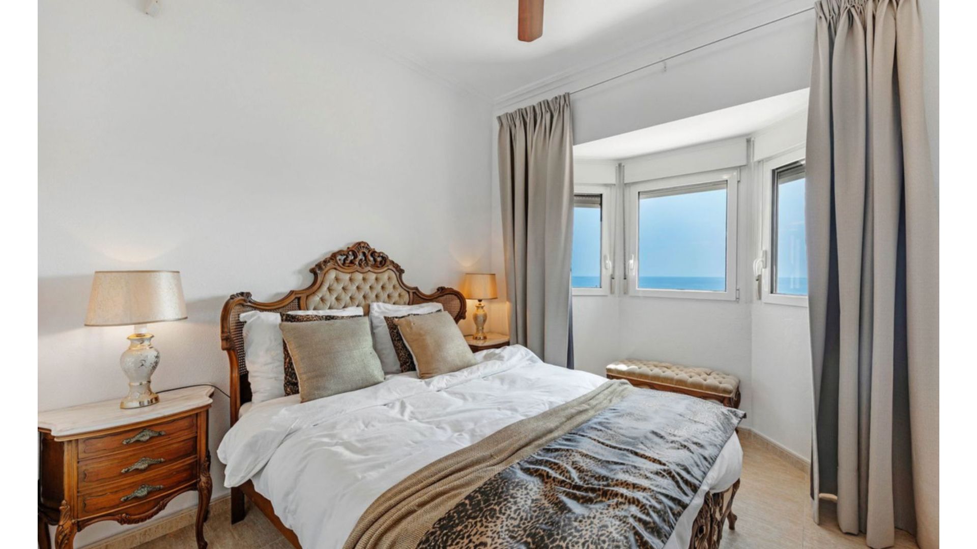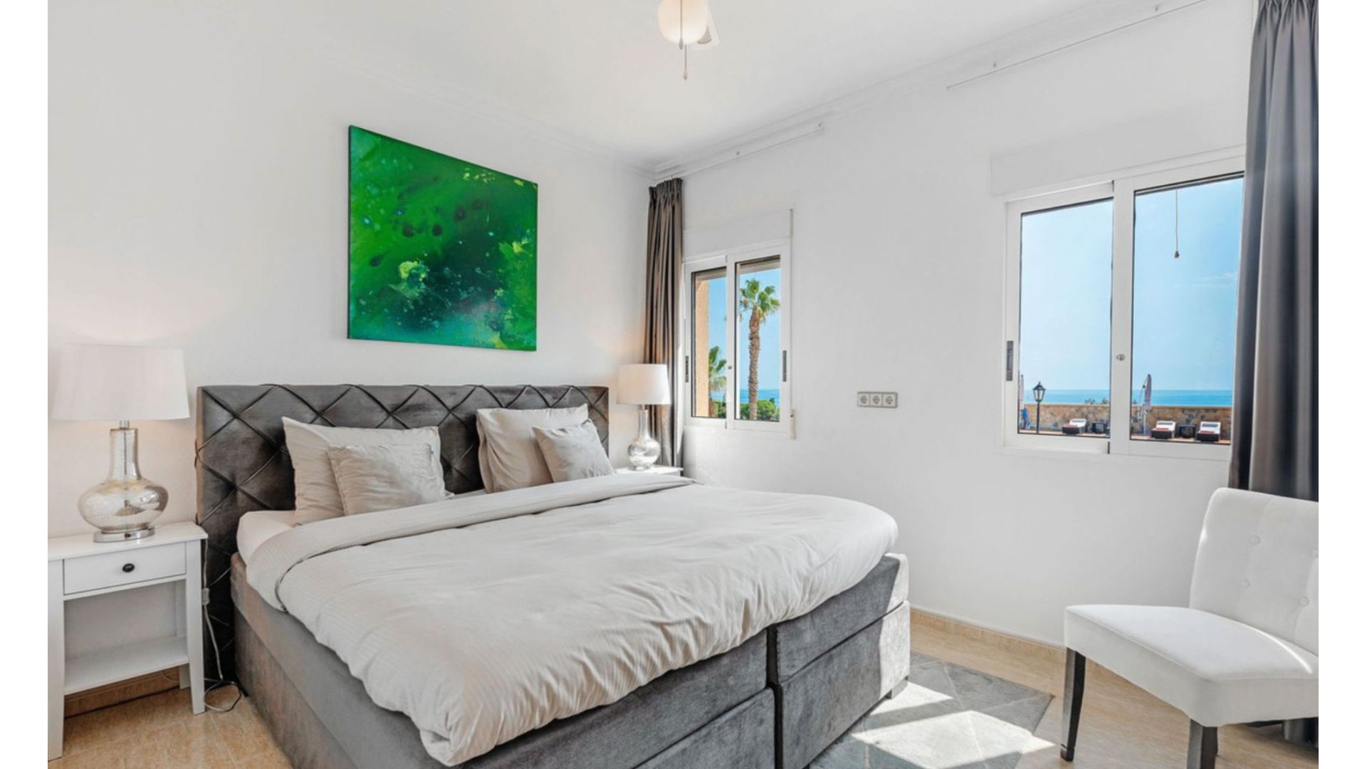 De luxueuze master suite beschikt over een eigen loungehoek, een walk-in closet, een ruime en-suite badkamer en een privéterras met spectaculair zeezicht over de Middellandse Zee.