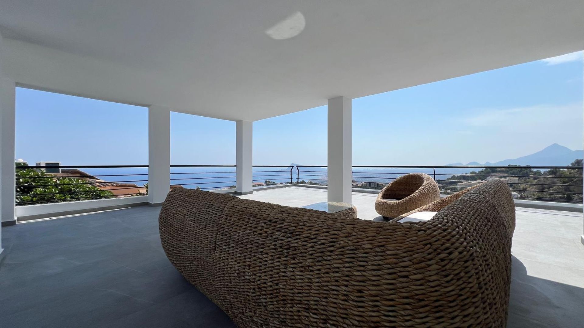 Grote glazen schuifpuien van vloer tot plafond verbinden de binnenruimte met de ruime terrassen, waardoor je continu kunt genieten van het prachtige uitzicht over de baai van Altea en het mediterrane landschap.