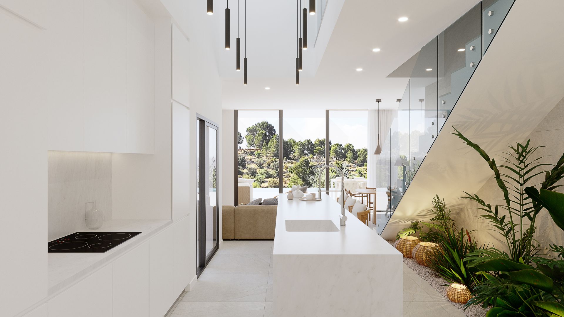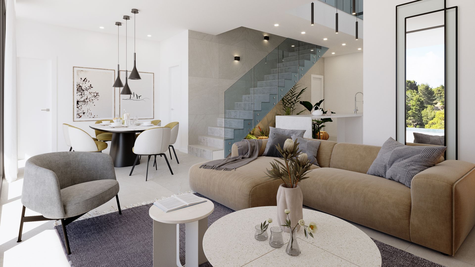 The house is distinguished by its architectural design that harmonises with the surrounding natural environment, exhibiting a modern and elegant aesthetic. The façades combine local materials such as stone and wood, providing a sense of warmth and belonging to the Mediterranean landscape. The large windows not only maximise natural light but also offer panoramic views of the Puig Campana mountain, the golf course and the surrounding green landscape. Each villa has spacious terraces and outdoor seating areas, ideal for enjoying the weather and the views. Private swimming pools, seamlessly integrated into the exterior design, invite moments of relaxation and entertainment in the privacy of your own home. The meticulously landscaped gardens are planted with low-maintenance native species, respecting local biodiversity and promoting a sustainable environment. The integration of outdoor lighting systems enhances the architectural beauty of the homes after dark, creating a welcoming and safe environment.