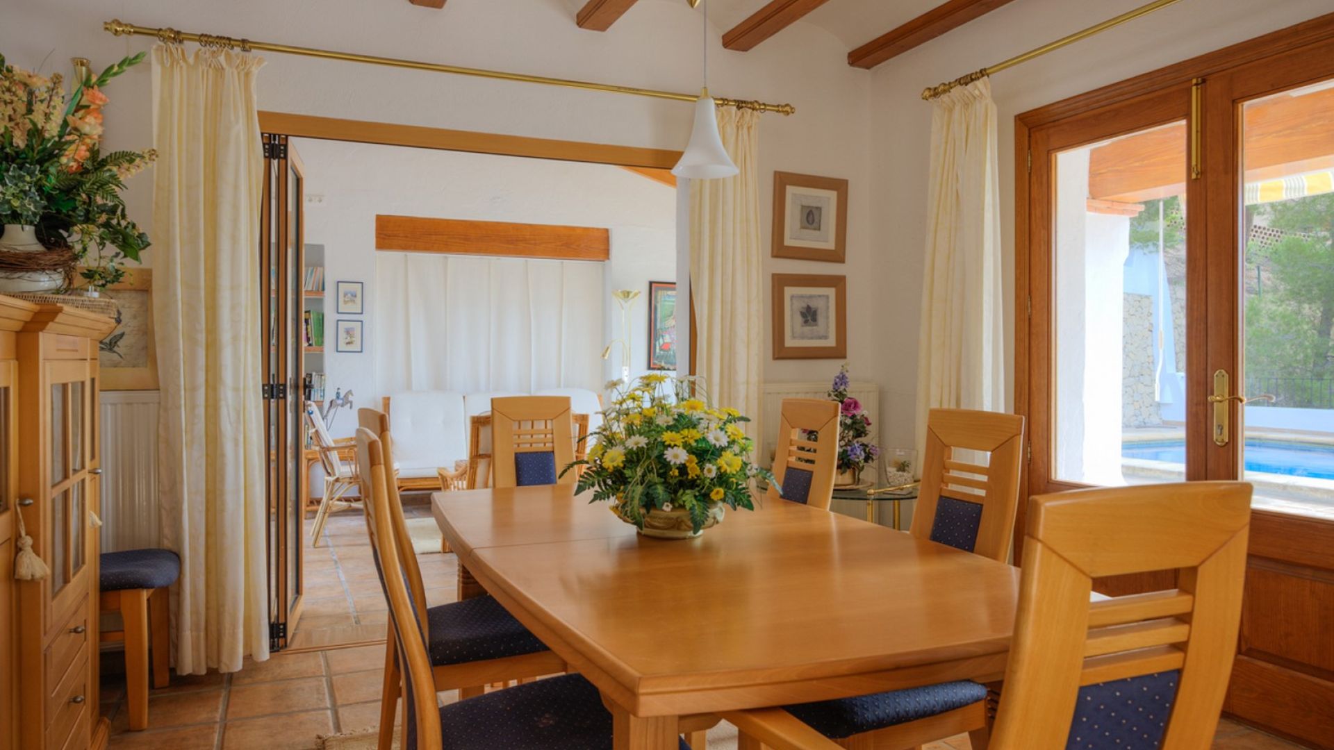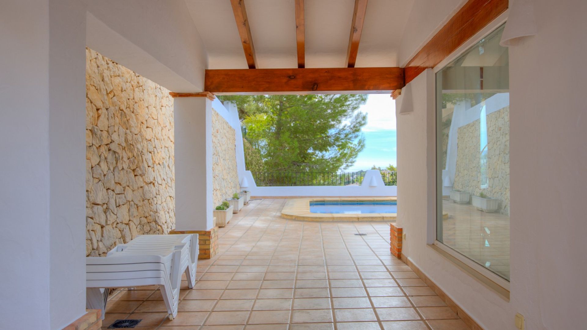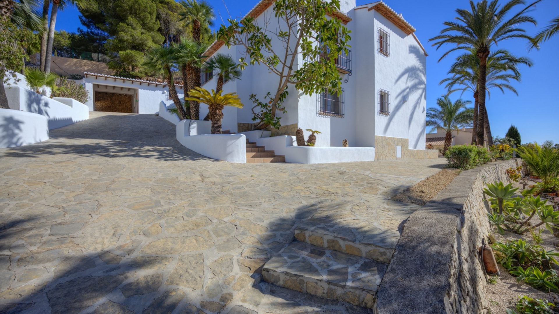 An Exclusive Sea View Villa for Sale in Prestigious San Jaime, MorairaPrepare to be captivated by this magnificent and large luxury villa boasting truly spectacular sea views within the highly prestigious San Jaime Moraira urbanisation. This is a privileged opportunity to secure one of the finest villas for sale in San Jaime Moraira, perfectly positioned on a quiet residential road just over a kilometre from essential amenities, including the golf clubhouse, supermarket, and the beautiful beaches.The heart of this superb 378 m2 property is its expansive open-plan living area, which elegantly spans the front of the building. The interconnected living room, dining room, and lounge area all open directly onto the sunny pool terrace, ensuring that fantastic sea views and abundant natural light flood every corner of this luxurious space. This design creates a beautiful, seamless indoor/outdoor lifestyle ideal for Mediterranean living.Practicality meets luxury in the well-designed layout. The main entrance level offers the huge advantage of level access from the parking area (no stairs!) and features an entrance hall, the main living zones, a fully equipped kitchen with access to an external barbecue terrace for effortless alfresco dining, two double bedrooms, a large bathroom and a second bathroom with shower. An internal staircase connects this to the lower floor, which provides further flexible accommodation, including a second lounge with direct garden access, a utility area with washing and toilet facilities, two more well-proportioned double bedrooms, and a second large bathroom. Additionally, the parking area includes a convenient garage with adjoining storage, as well as a dedicated room housing a sauna for relaxation.The property is completed by fully enclosed, low-maintenance Mediterranean gardens, beautifully stocked with a selection of palms and plants and finished with gravel for ease of care. If your search is focused on finding premium sea view villas in Moraira that perfectly blend space, high-end luxury, and an unbeatable location, this exceptional property is an absolute must-see.